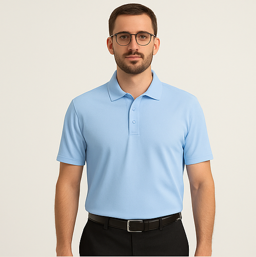Refresh your wardrobe with our Sky Blue Polo T-Shirt – a perfect balance of classic design and all-day comfort. Crafted from a premium cotton-blend fabric, this polo t-shirt delivers a soft touch, breathable feel, and stretchable fit for unmatched comfort. The calm and refreshing sky blue color adds a touch of elegance and versatility, pairing effortlessly with formal pants or denim. With its structured ribbed collar, three-button placket, and neatly finished half sleeves, this t-shirt is your go-to option for both office and casual settings.
