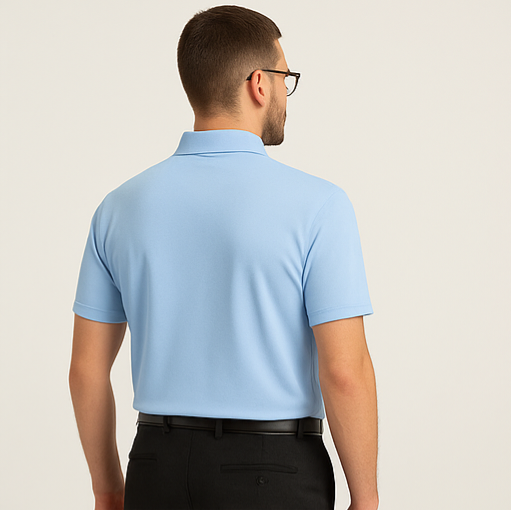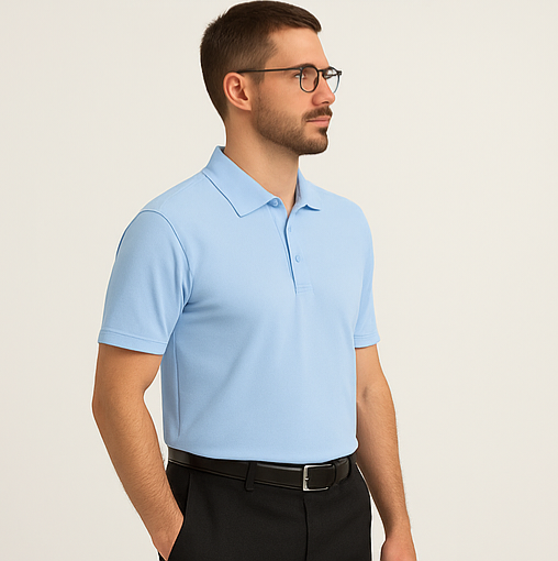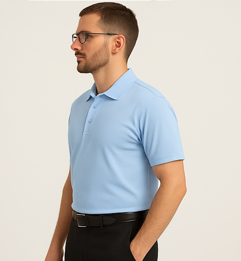 Refresh your wardrobe with our Sky Blue Polo T-Shirt – a perfect balance of classic design and all-day comfort. Crafted from a premium cotton-blend fabric, this polo t-shirt delivers a soft touch, breathable feel, and stretchable fit for unmatched comfort. The calm and refreshing sky blue color adds a touch of elegance and versatility, pairing effortlessly with formal pants or denim. With its structured ribbed collar, three-button placket, and neatly finished half sleeves, this t-shirt is your go-to option for both office and casual settings.